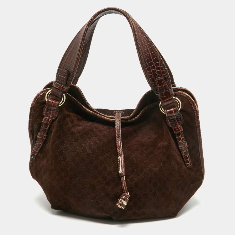 Celine Dark Brown Macadam Suede and Croc Embossed Leather Bittersweet Hobo