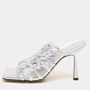 Pre Owned Bottega Veneta Grey Python Embossed Leather And Satin Ankle Strap Peep Toe Ankle Cuff Sandals Size 37.5