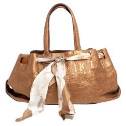 Carolina Herrera Metallic Grey Monogram Embossed Leather Scarf Tote