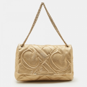 Carolina Herrera Navy Blue Logo Embossed Leather Metal Flap Shoulder Bag