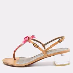 Lanvin Light Brown/Pink Leather and Fabric Bow Thong Ankle Strap Sandals Size 37