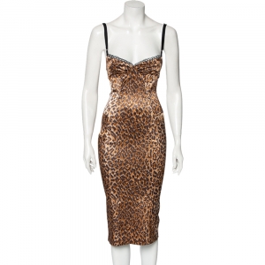 D&G Brown Leopard Print Silk Long Sleeve Midi Dress L