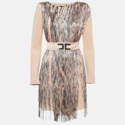 Elisabetta Franchi Beige Fringed Jersey Belted Midi Dress M