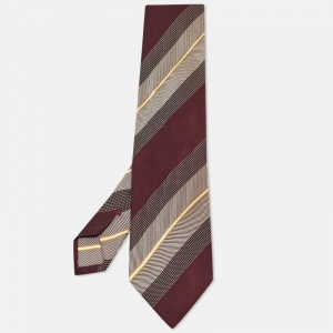 Ermenegildo Zegna Navy Blue and Off White Diagonal Striped Patterned Silk Jacquard Tie