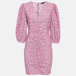 Maje Pink Embroidered Floral Print Cotton Ruched Mini Dress M