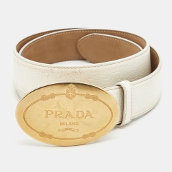 Prada White Leather Engraved Oval Plaque Buckle Belt 90CM