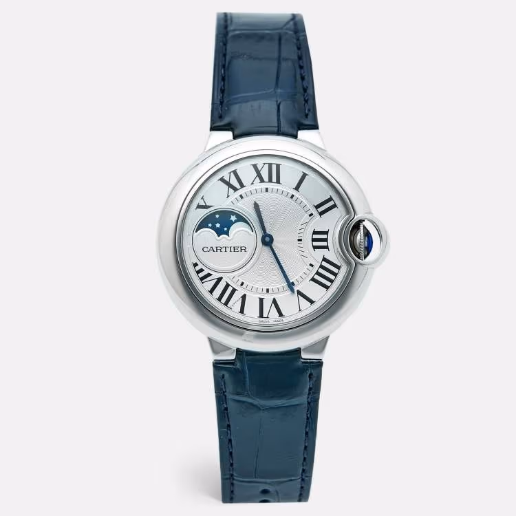 Cartier Ballon Bleu Moonphase WSBB0029 Silver Dial Stainless Steel Alligator Leather Men's Wristwatch 37.50 mm