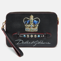 Dolce & Gabbana Black Leather Studded Crown Print Pouch Briefcase