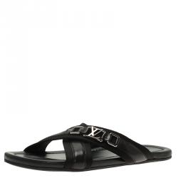 Louis Vuitton Black Leather Cross Strap Flat Slides Size 42.5