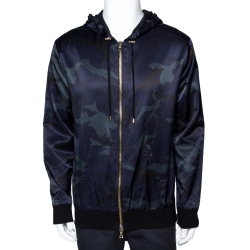 Balmain Navy Blue Camouflage Print Cotton Blend Zip Front Hoodie L