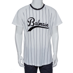 Balmain White Striped Cotton Velvet Logo Detail Crewneck T-Shirt XXL