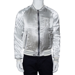 Balmain Silver Satin Logo Embroidered Medallion Bomber Jacket XS