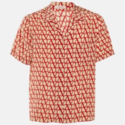 Valentino Beige /Red All Over V -Logo Print Silk Shirt XS