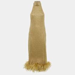 Oseree Gold Lurex Knit Ostrich Feather Detail Halter Neck Midi Dress M