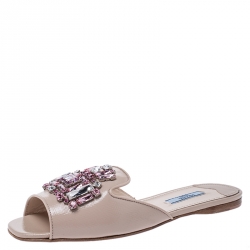 Prada Beige Patent Leather Crystal Studded Bow Slingback Sandals Size 38