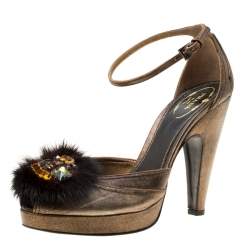 Prada Brown Croc Embossed Leather Peep Toe Platform Pumps Size 37