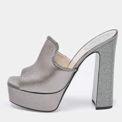 René Caovilla Silver Leather Crystal Embellished Platform Sandals Size 37.5
