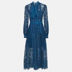 Self-Portrait Navy Blue & White Lace & Pleated Chiffon Midi Dress M