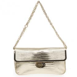 Just Cavalli Gold Metallic Crocodile Embossed Leather Small Clutch Bag