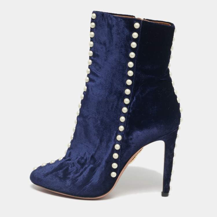 Pre Owned Aquazzura Navy Blue Velvet Follie Pearls Ankle Boots Size 36.5