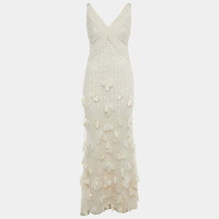 Pre Owned Badgley Mischka White Sequin Undelay Tulle Applique Gown M