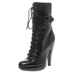 Burberry Black Leather And Brown Mega Check Canvas Lace Up Fur Lined High Weather Boots Size 36