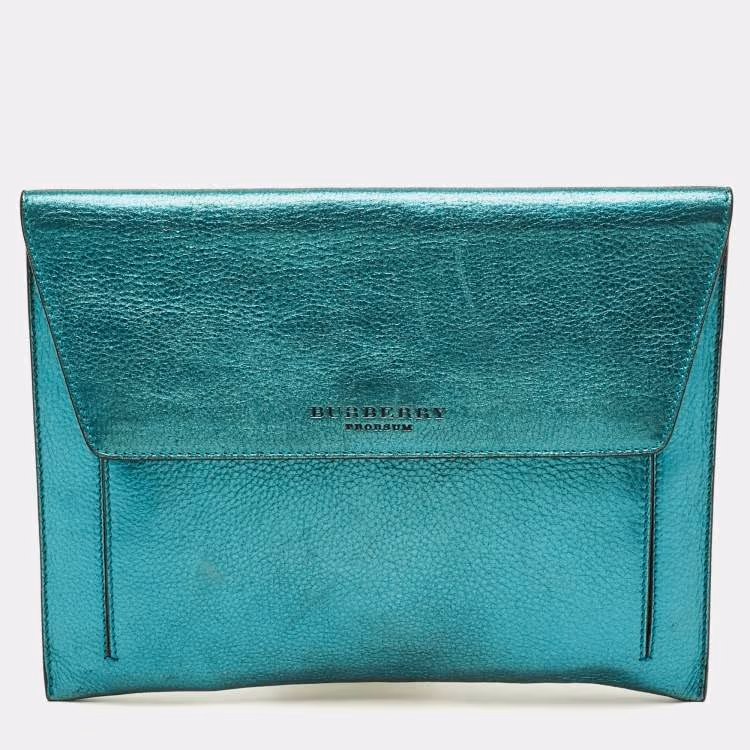 Pre Owned Burberry Metallic Green Leather Envelope Clutch