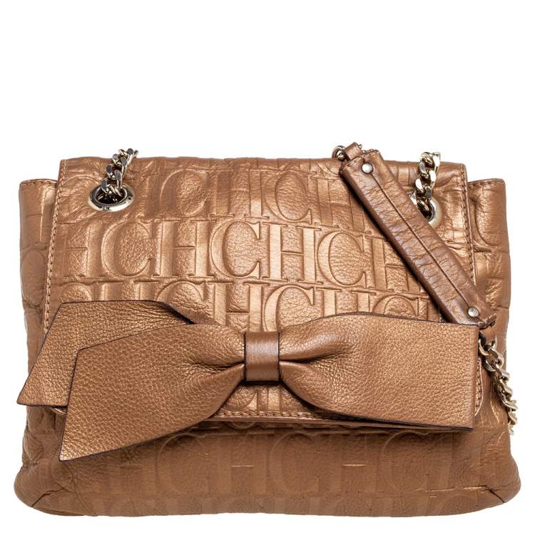Pre Owned Carolina Herrera Metallic Gold Monogram Embossed Leather Bow Flap Shoulder Bag