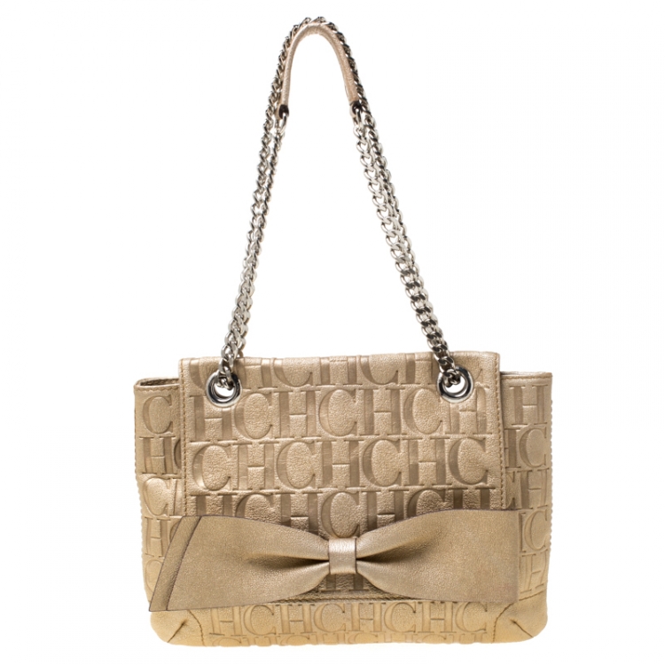 Pre Owned Carolina Herrera Metallic Gold Monogram Leather Audrey Shoulder Bag