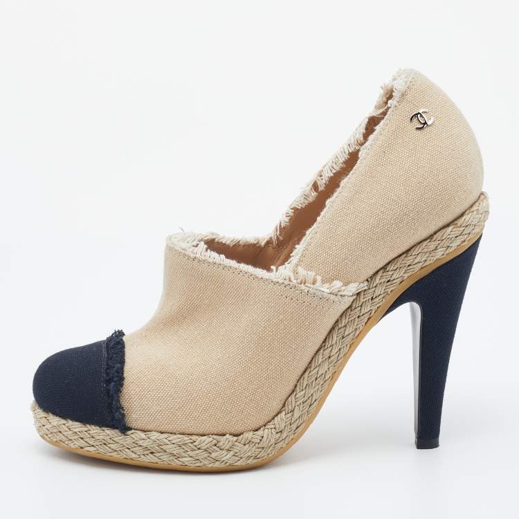 Pre Owned Chanel Beige/Black Canvas CC Cap Toe Espadrille Booties Size 38