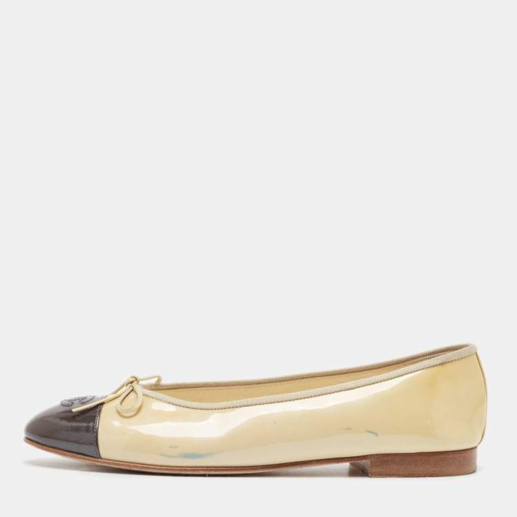 Chanel Beige/Black Patent Leather CC Ballet Flats Size 42