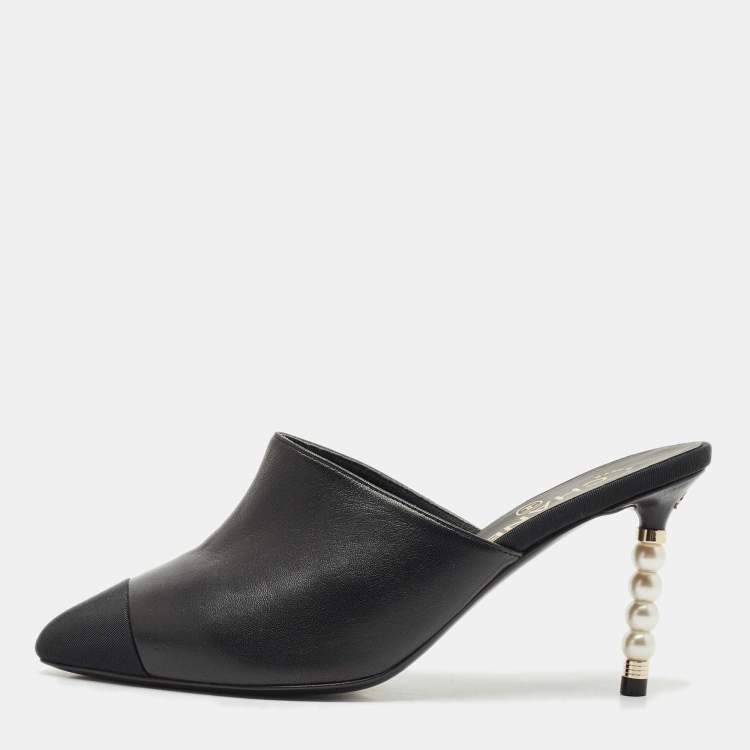 Chanel Black Leather and Fabric Cap Toe CC Pearl Embellished Mules Size 35.5