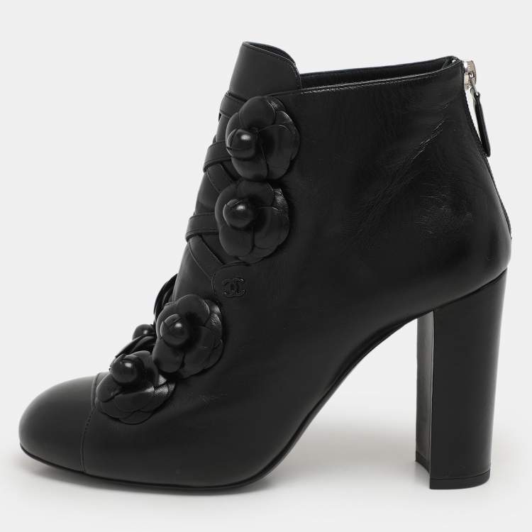 Chanel Black Leather Camellia Block Heel Ankle Boots Size 39