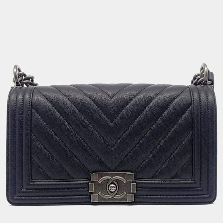 Pre Owned Chanel Black Leather Caviar Chevron Boy Bag Medium