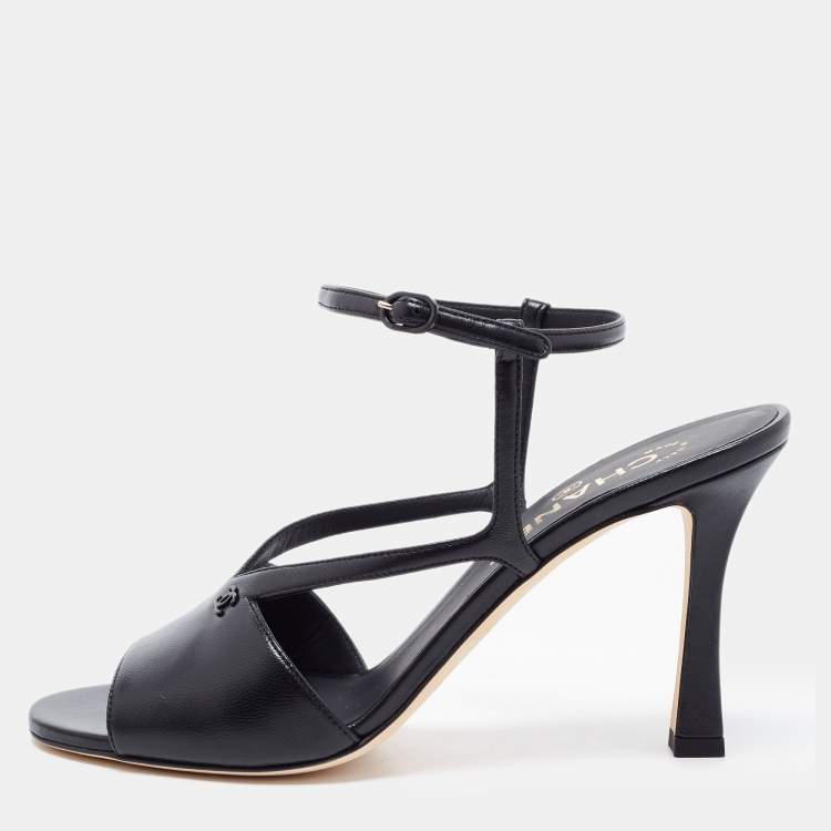 Chanel Black Leather CC Ankle Strap Sandals Size 38