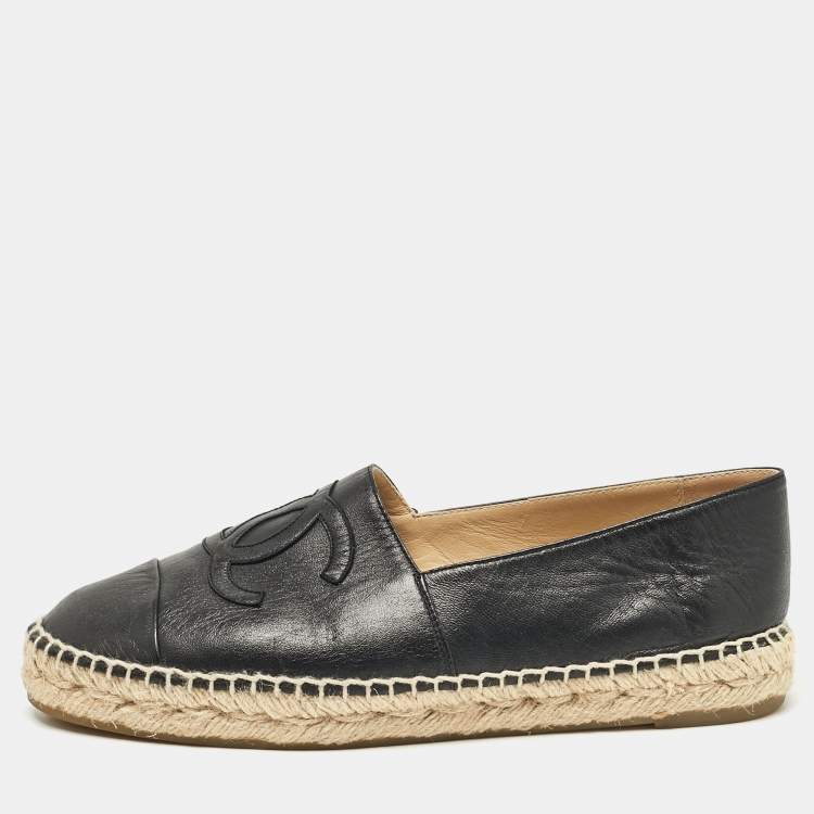 Chanel Black Leather CC Cap Toe Espadrille Flats Size 38