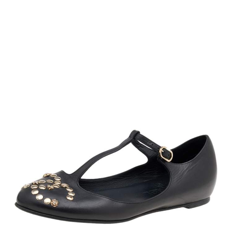 Chanel Black Leather CC Embellished T Strap Ballet Flats Size 35.5