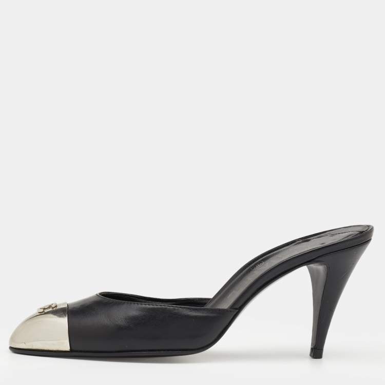 Chanel Black Leather CC Metal Cap Toe Mule Sandals Size 38.5