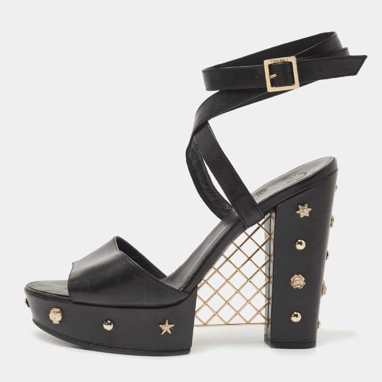 Chanel Black Leather Embellished CC Block Heel Ankle Strap Sandals Size 40.5