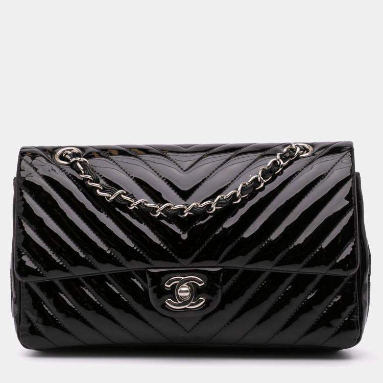 Pre Owned Chanel Black Medium Classic Chevron Patent Double Flap Bag