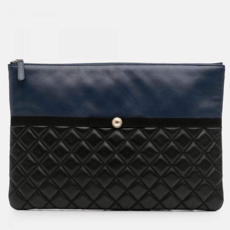 Pre Owned Chanel Black Navy Blue Large Bicolor Quilted Leather Pearl O Case Clutch