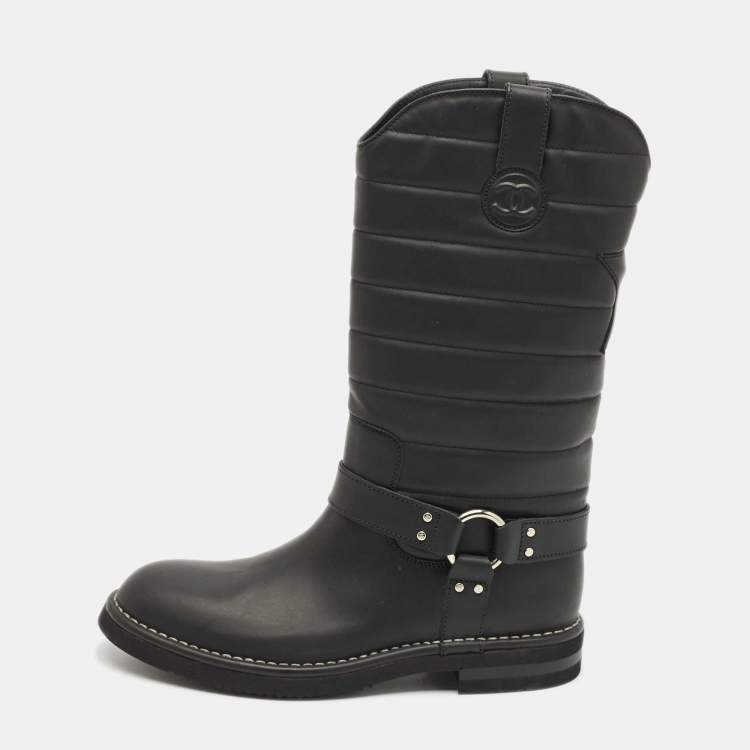 Pre Owned Chanel Black Nylon and Leather CC Logo Star Biker Boots Size 40