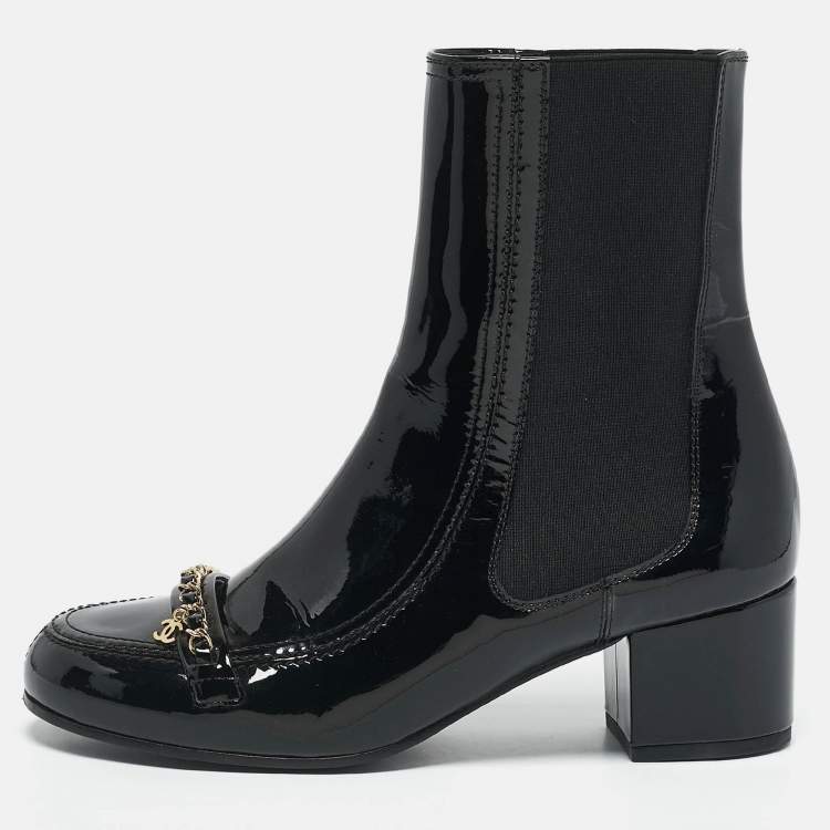 Pre Owned Chanel Black Patent Leather CC Chain Detail Ankle Boots Size 39