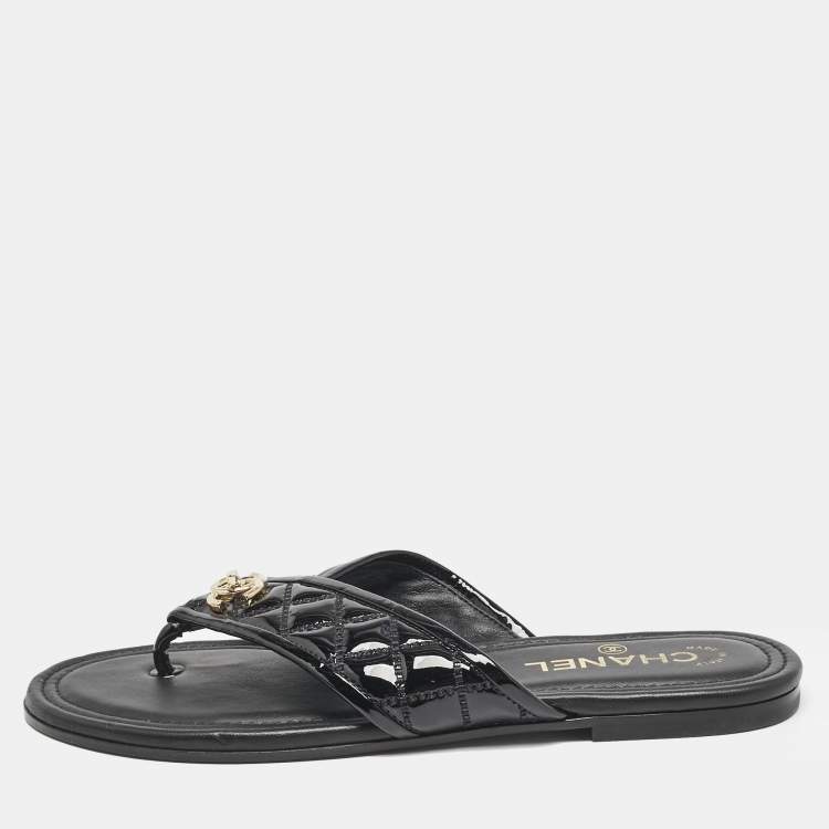 Pre Owned Chanel Black Patent Leather CC Lock Thong Flat Sandals Size 38