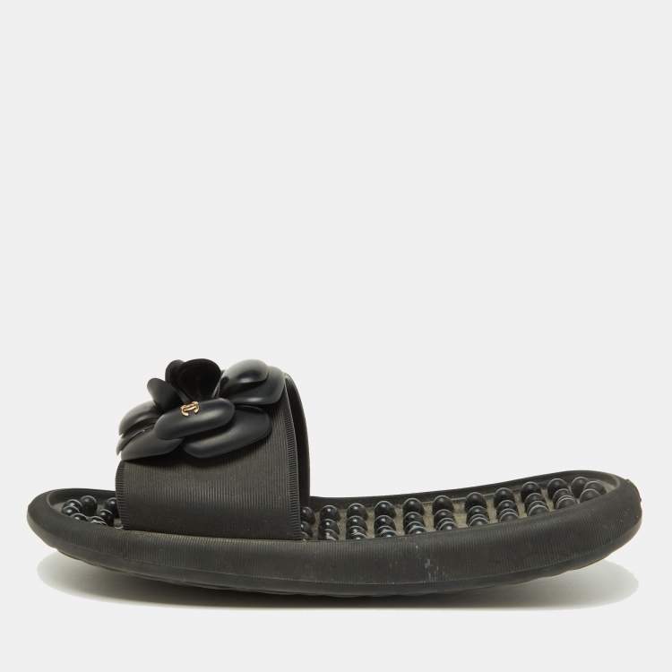 Chanel Black Textured Rubber CC Camellia Flat Slides Size 36
