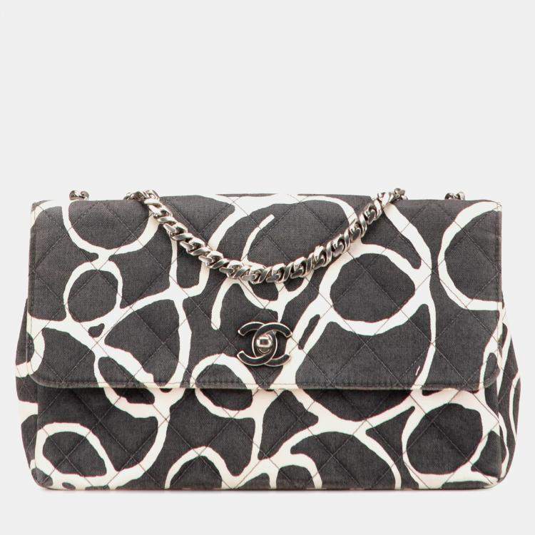 Chanel Black White Medium CC Quilted Printed Canvas Single Flap Bag