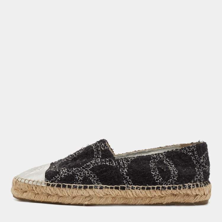 Pre Owned Chanel Black/Silver Tweed and Leather Cap Toe CC Espadrille Flats Size 39