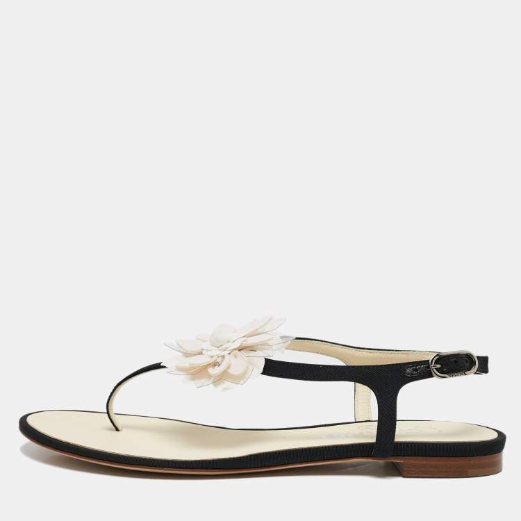 Chanel Black/White Canvas and Leather CC Camellia Flat Thong Sandals Size 37