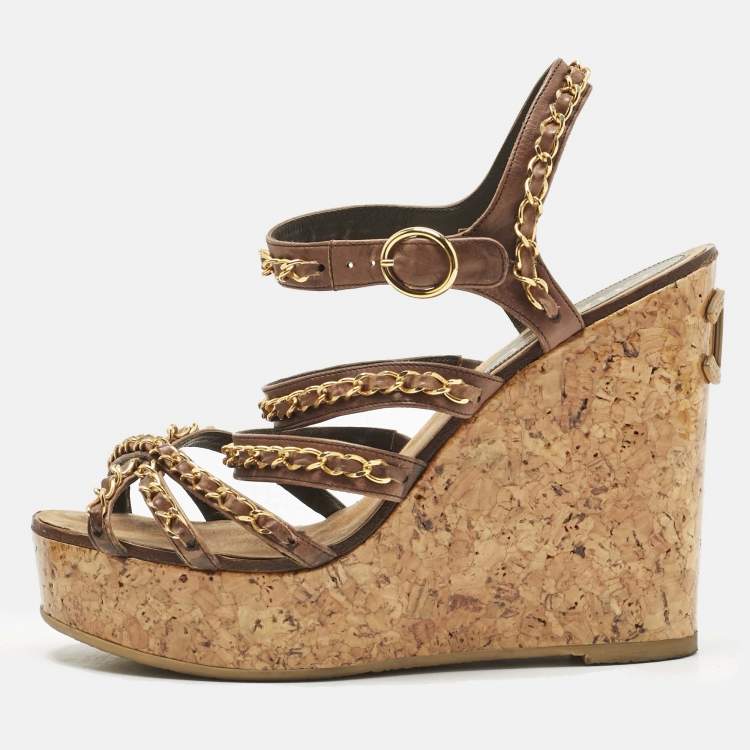 Pre Owned Chanel  Brown Leather CC Chain Link Straps Cork Platform Wedges  Sandals Size 39.5