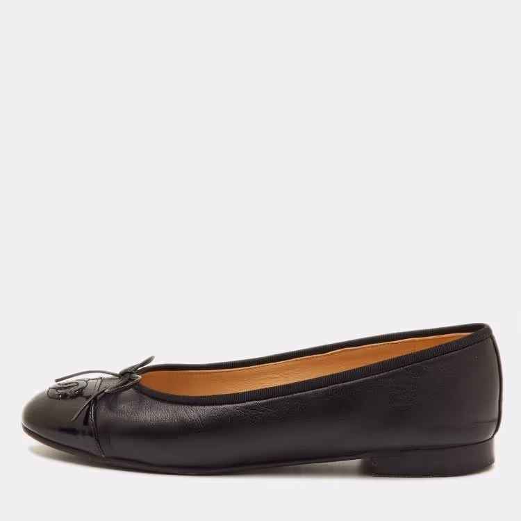 Pre Owned Chanel CC Size 35 Black Leather Bow Cap Toe Ballet Flats